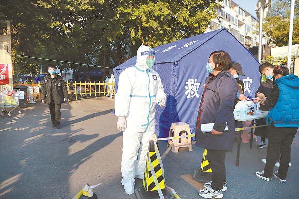 图为10月20日,北京市丰台区纪委监委第二监督检查室工作人员到新增确诊病例所在街道,对隔离期间工作人员配备、社区物资储备及配送情况等进行监督检查。李承橙 摄