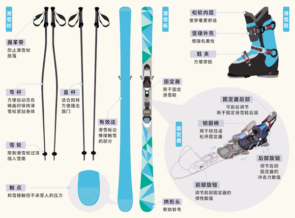 让没有翅膀的人类体验飞翔的感觉,关键是高山滑雪器材的助力,特别是滑雪板、滑雪杖、滑雪鞋、固定器4件主要器材。